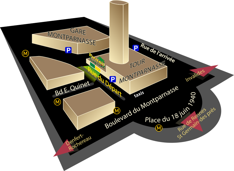 Entrées du parking par la rue du Départ (le parking est situé sous la tour Montparnasse) ou par la rue de l’arrivée.